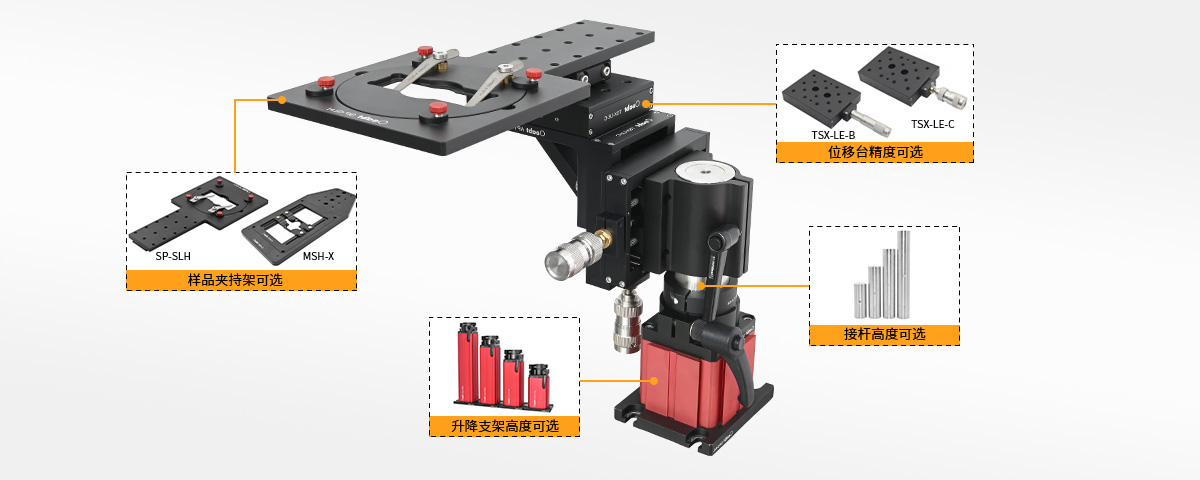 • 搭配TSX-LE-B位移台(行程±12.5mm,分度0.01mm)或TSX-LE-C位移台(粗调行程±12.5mm和细调300μm,精度1μm;