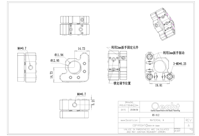 • MS-A12(带锁定):三个M5*0.25调节器,每圈12.8mrad/rev(0.73°)调节;
