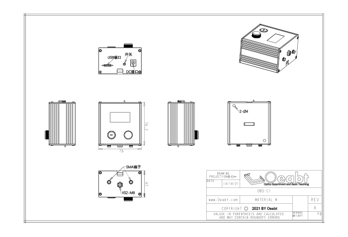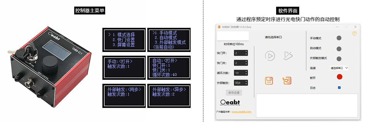 OBS-C1光电快门控制器用于驱动和控制单路通道的光电快门或其他电磁线圈类设备。可连接Oeabt OBS-P1光电快门和兼容此接口的其他由电流和脉冲驱动的执行器。