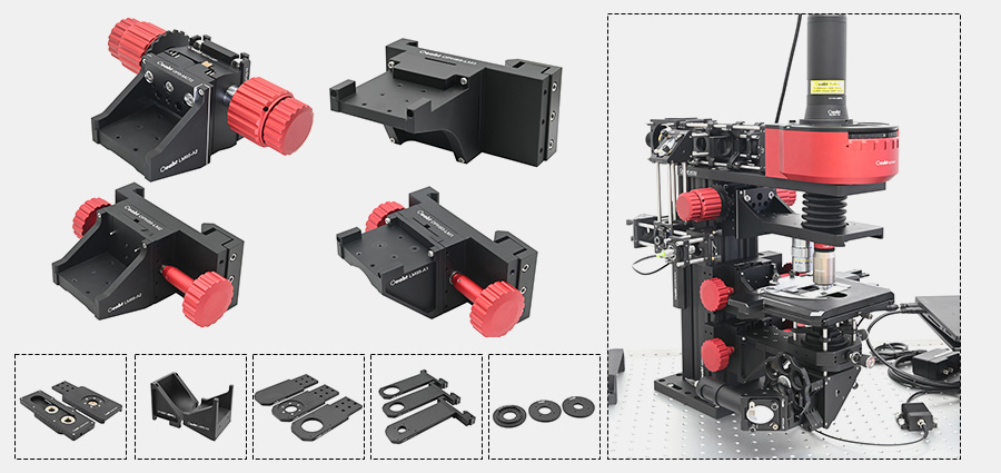 有多种类型的安装臂架,可以将物镜、聚光镜、微距镜头和透镜套筒或笼式系统沿光轴集成对准,支持自搭建聚光镜或其他光机组件。
