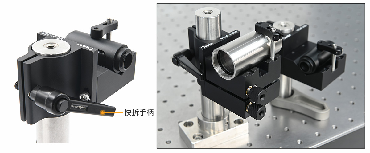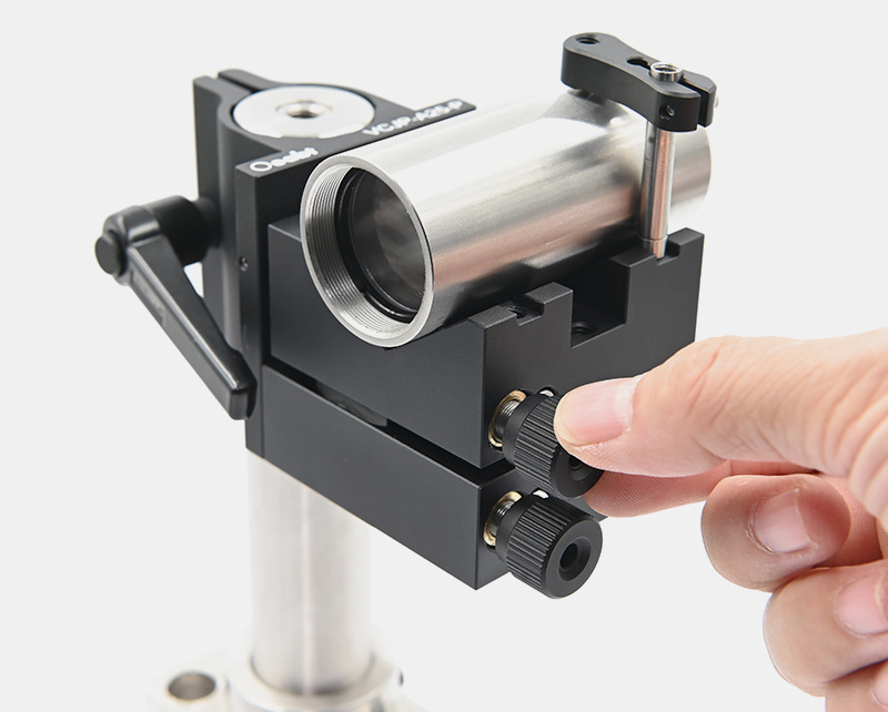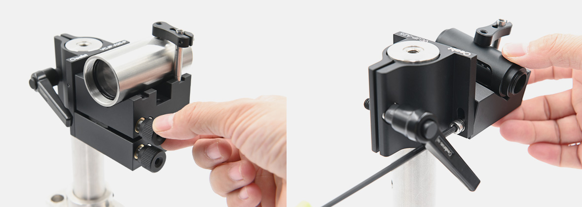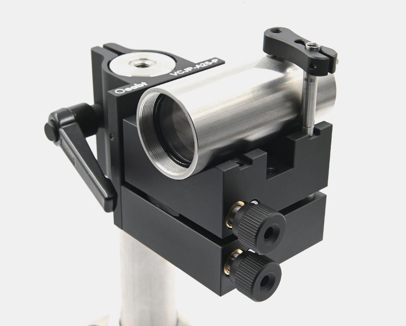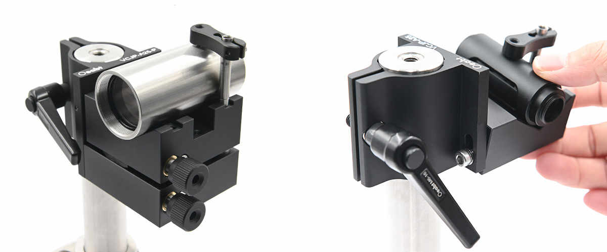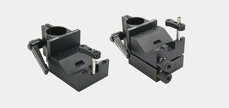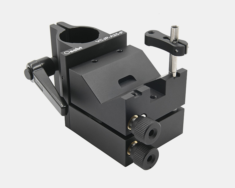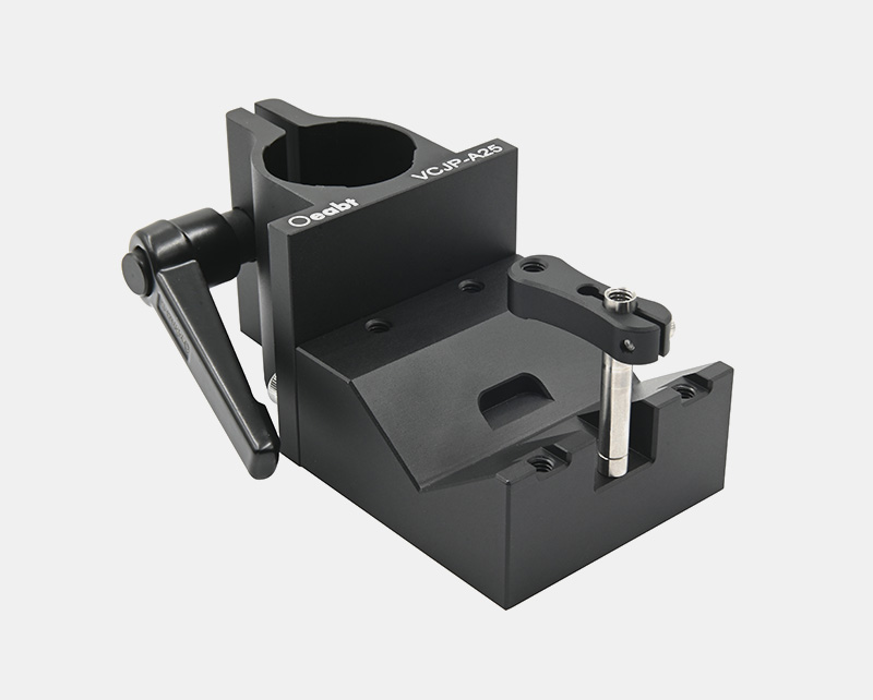 通过手柄驱动的挠性夹持将V形夹具座安装在Ø25mm接杆上,提供夹持圆柱形组件的仰俯、偏转调节。