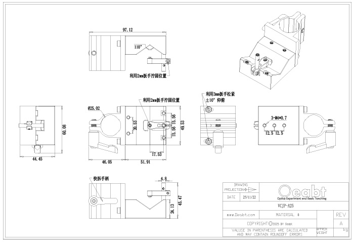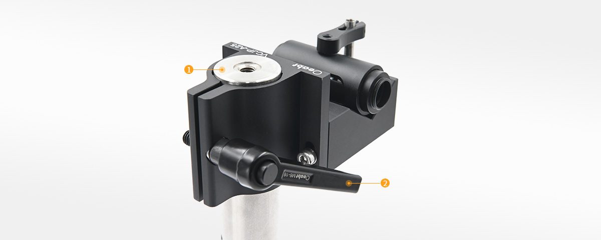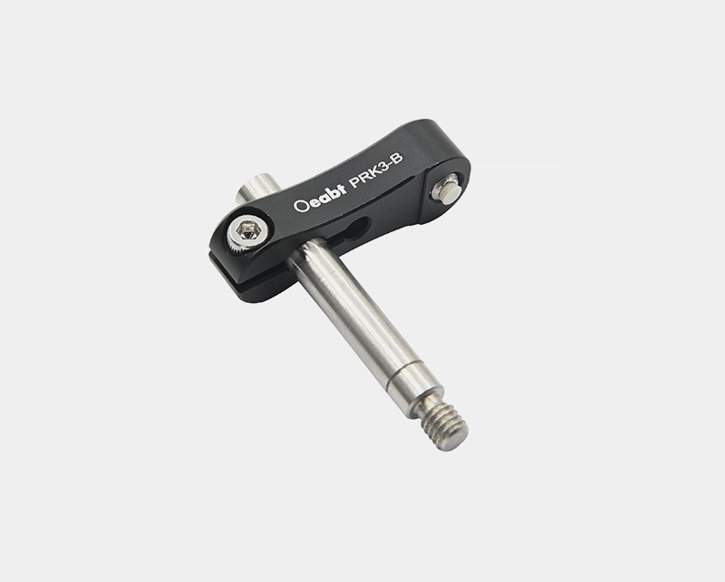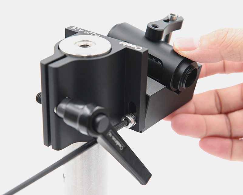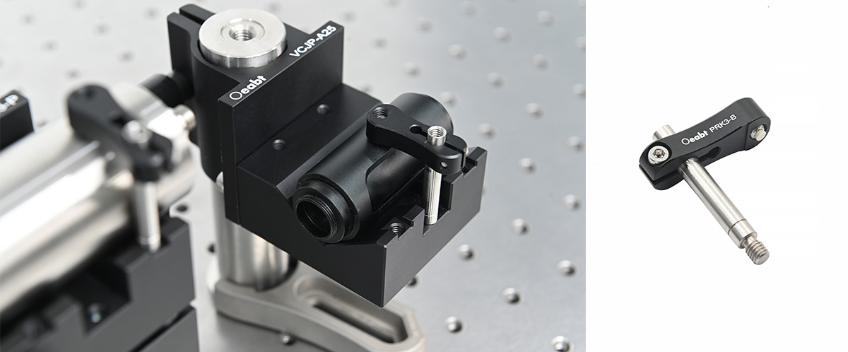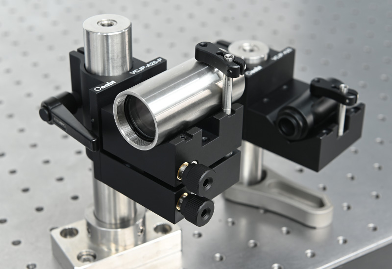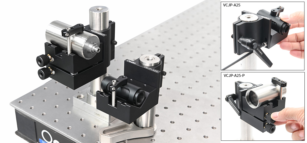 通过手柄驱动的挠性夹持将V形夹具座安装在Ø25mm接杆上,提供夹持圆柱形组件的仰俯、偏转调节。